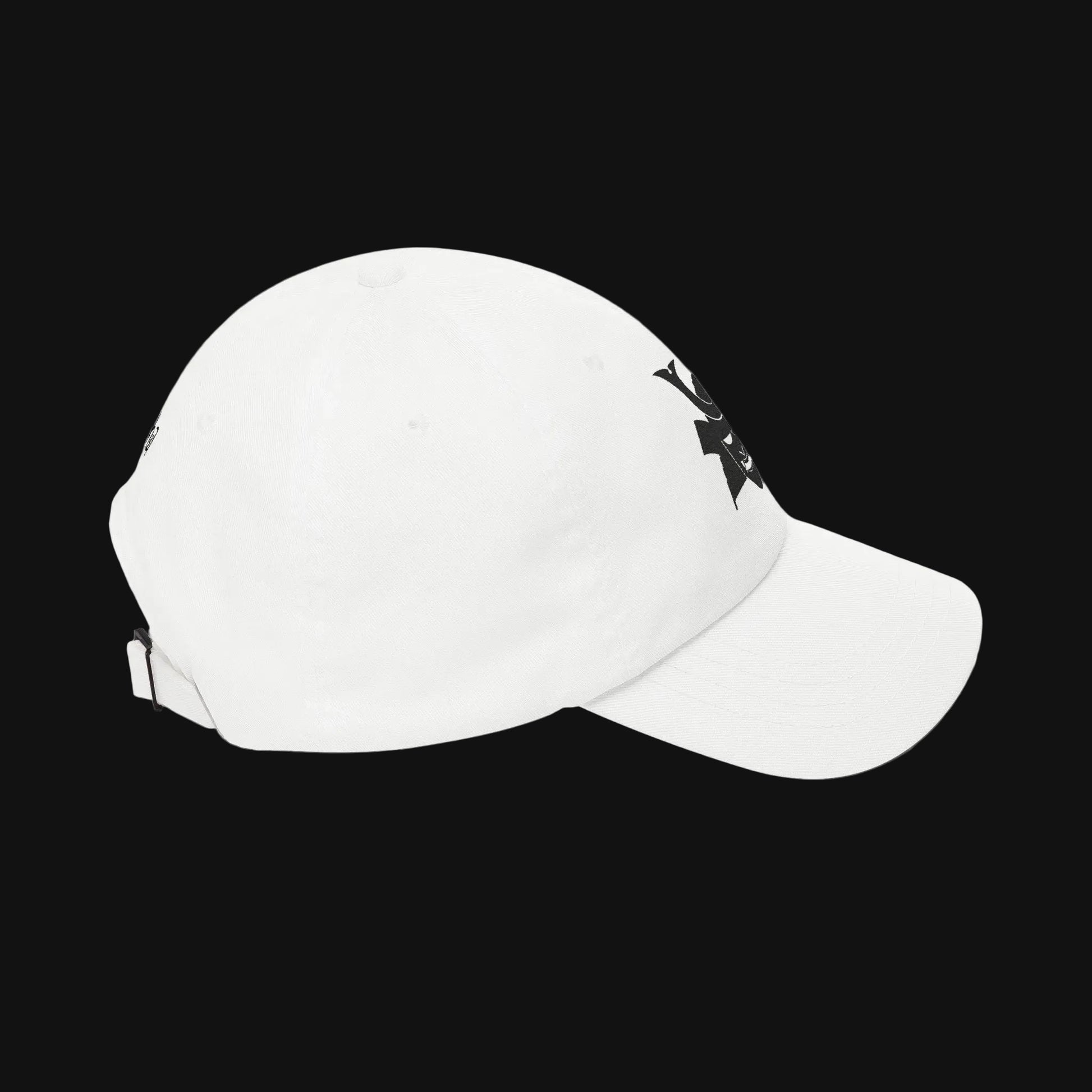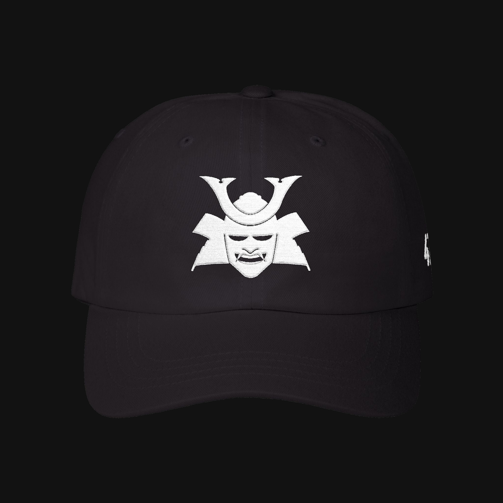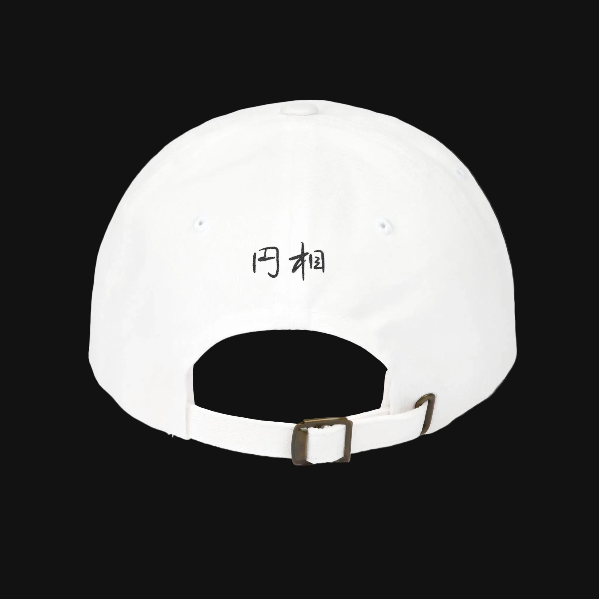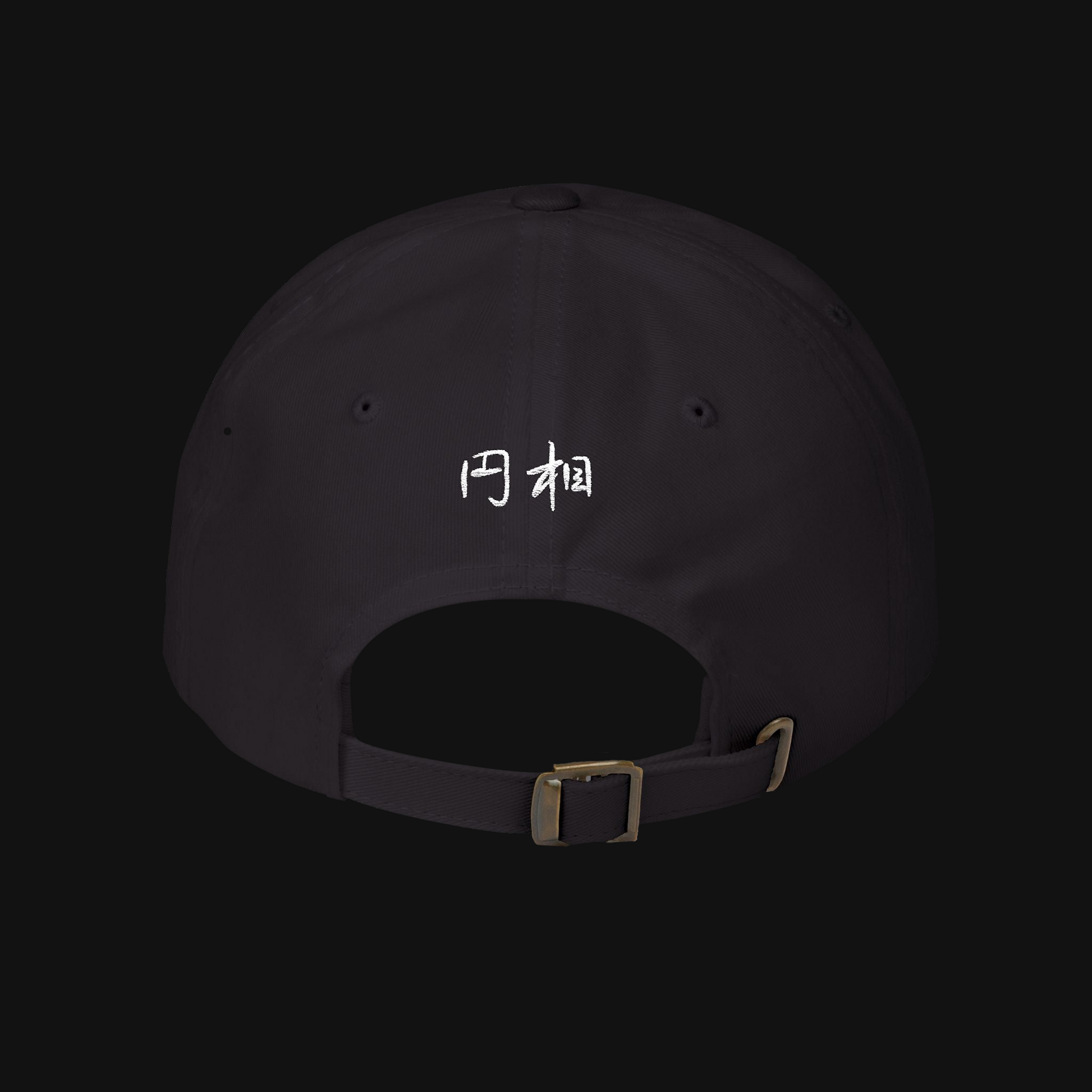 Menpō mask front embroidery. 円相 kanji rear. Structured dad cap, adjustable brass buckle strap.
